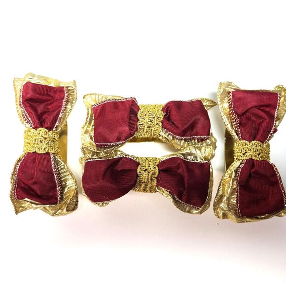 Vintage Brass & Fabric Bow Napkin Rings Deep Red Gold Taiwan
