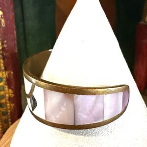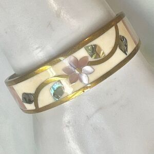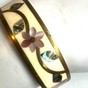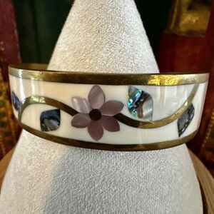 #vintagejewelry #inlaybracelet #brassbangle #shellinlay #bohostyle #abalonebracelet #signedjewelry #Ali #floralcuff #retrostyle #eclecticjewelry