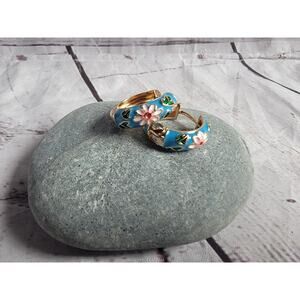 Vintage Brass Gold Tone Floral Flowers Cloisonne Hoop Earrings Blue Pink