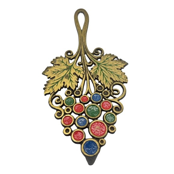 Elegant and durable trivet featuring a brass grapevine design with vibrant enamel accents. Suitable for protecting surfaces while adding a decorative touch.