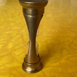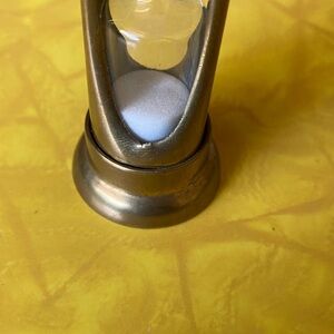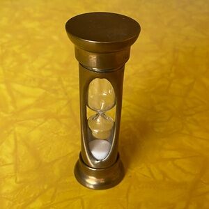 Elegant brass hourglass with white sand. Perfect for decor or timing tasks. Runs for 5 minutes. Great for hard boil eggs or when you need to give yourself 5 minutes to reset! In working condition