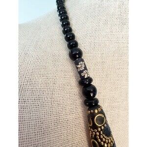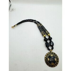 Vintage Brass Inlay Black Chunky Bohemian Necklace Large Pendant Tribal Ethnic