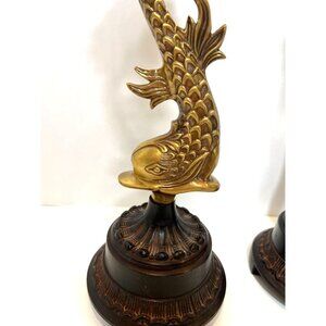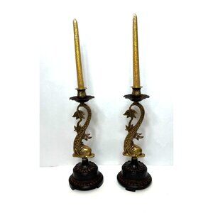 Elegant pair of koi or dolphin candlestick holders with intricate patina details and a sturdy base. Ideal for accentuating a classic or nautical-themed décor.