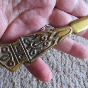 In vintage condition, some pitting, but overall in good condition, this fun letter opener has enamel on the top. Measures 7.25" long x 1" wide.