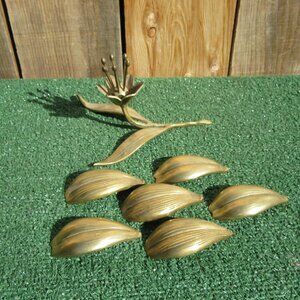I am selling a Vintage Brass Lotus Flower Ashtray 6 Removable Petals. It is pre-owned and in good condition. It measures about 9" in length and it is about 7" tall with the petals in it. It is a brass lotus/lily flower. There are 6 removable flower petals.