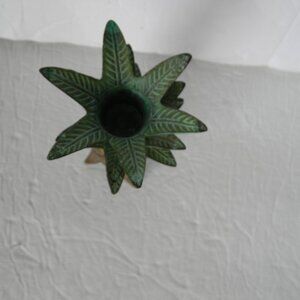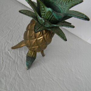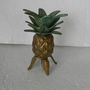 Vintage Brass Metal Pineapple Taper Candle Holder Hawaiian Tropical 4.75"TALL, VINTAGE USED CONDITION, ONE LEG SHOWS SOME TARNISHING AS SHOWN, SOME OVERALL SIGNS OF TARNISHING/WEAR. NO MARKINGS. SO CUTE!