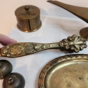Fantastic mixed lot of vintage solid brass pieces—perfect for collectors, display, or unique desk décor! Includes six charming and functional items with timeless patina and ornate design: