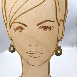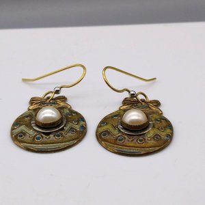 Vintage Brass Ornament Dangle Earrings, Ornate Gold Tone with Green Enamel and Center Faux Pearl, Christmas Party Holiday Wear