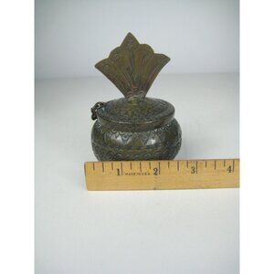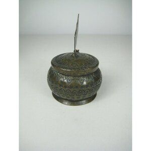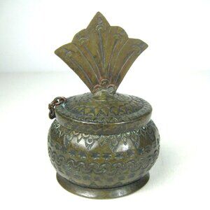 Vintage Brass Ornate Hinged Lidded Container Fan Handle Geometric Pattern