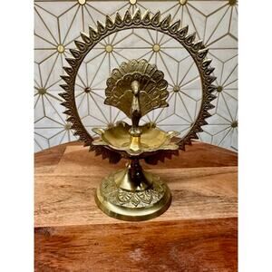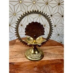 Add a touch of elegance and cultural charm to your home with this vintage brass peacock incense oil lamp. Featuring intricate detailing, this piece showcases a proud peacock surrounded by an ornate circular design, making it a stunning decorative item with both aesthetic and functional appeal.