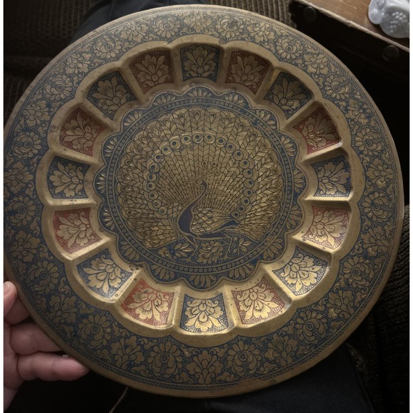 Vintage Brass Peacock Plate Metal Tray Enameled Etched Wall Hanging Decorative