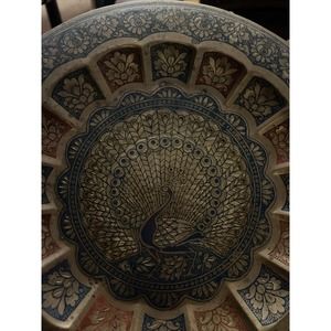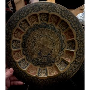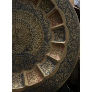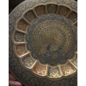 This exquisite vintage brass plate features a stunning peacock design that will add an elegant touch to any home decor. Crafted with high-quality brass, this metal tray showcases intricate enameled etchings that highlight the beauty of the peacock feathers. The plate is perfect for wall hanging or as a decorative piece on a table or shelf.