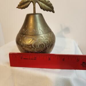 Charming vintage brass pear-shaped trinket box with a detailed etched floral design and leaf handle lid. Measures approximately 5 inches tall including the stem. The interior and exterior both show light age patina and wear consistent with vintage brass. A unique piece that works as a trinket holder, jewelry box, or decorative accent.