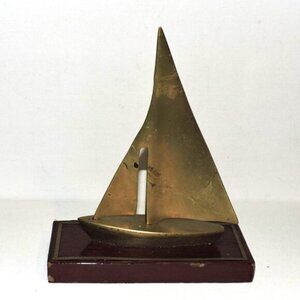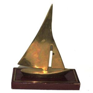 This vintage brass sailboat on wood base was made in Korea. The brass does have some wear and pitting due to age. Wood base does show some marks.