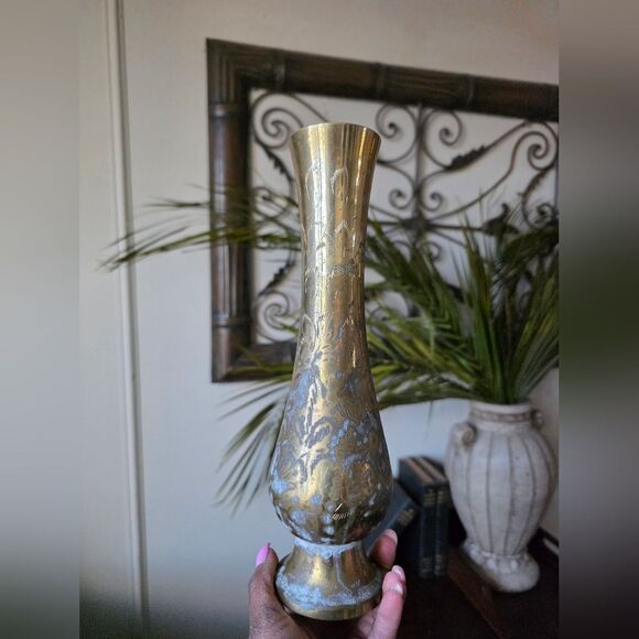 Vintage Brass Stem Bud Vase Tall Etched 11 1/4'H