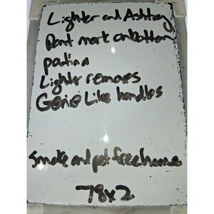 This vintage brass tabletop set includes a lighter and ashtray, offering a unique aesthetic to any space. Its distinctive design and durable brass construction make it a functional piece. The set's vintage appeal is perfect for collectors or those who appreciate a classic touch in their decor.