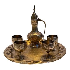 The set includes a pitcher (aftaba/ewer) **please note it is missing the spout but looks beautiful as a decorative piece, four goblets, and a serving tray, all made of brass.