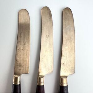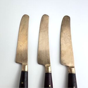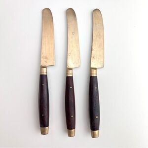 Vintage Brass Teak Inlaid Wood Butter Knives Set Of 3.