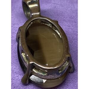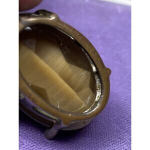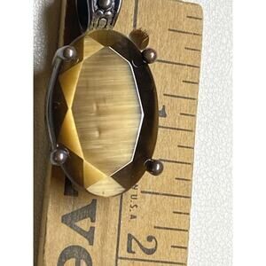 This vintage pendant features a striking oval Tiger’s Eye gemstone with a faceted surface that highlights the stone’s natural chatoyancy (“cat’s eye” effect). The stone is bezel and prong set in a warm brass frame with a decorative bail, adding a touch of artisan character.
