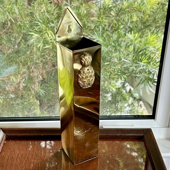 This elegant brass wall-mount match holder features a raised pineapple emblem and glossy finish, this mid-century piece is both decorative and functional. The holder is designed for long matches and includes a hanging hole for easy wall display. Includes matches shown