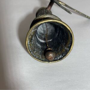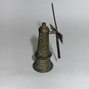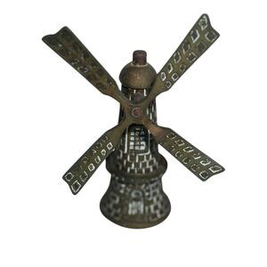 Charming vintage brass windmill bell. Features intricate detailing in brown and silver tones.