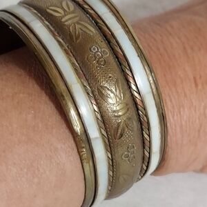 Vintage Brass and Mother of Pearl Bangle Bracelet Etched with decorative accents