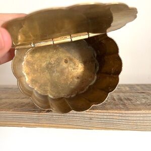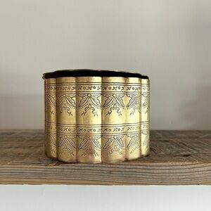 Solid brass tea caddy or canister. Lid hinged and rests on top. Very pretty and unique piece. Scalloped walls and etched floral motif throughout.