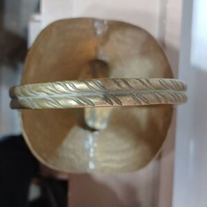 The object is a vintage brass clamshell basket planter, often used as a decorative item or planter. These planters come in various sizes, with some being quite large. The brass material often has a patina, giving it a warm, aged appearance.