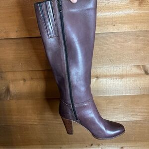 Description: Stunning brown leather knee high boot. Full zipper side with extended stretch at calf. Fits true to size. Cute buckle on ankle. Daily wear / scuff on boot. No significant scratches or knicks.