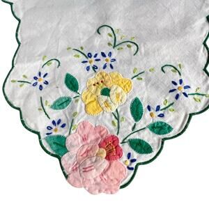 Mid century, embroidered, Applique, Floral, handmade, grannycore, grandmacore, cottagecore, vintage kitchen, vintage tablescape, artisan made, 1950s,1960s, Victoriana, Romantic
