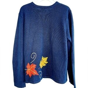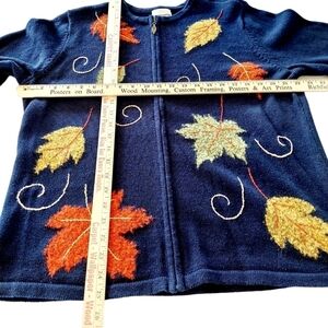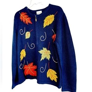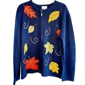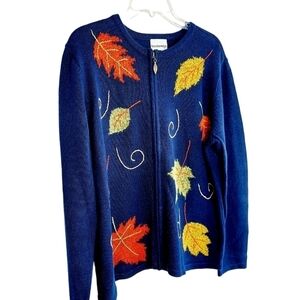 Vintage Breckenridge Womens Large Fall Cardigan Sweater Zip Front Autumn Leaves Navy Blue.