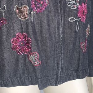 100% cotton lightweight zip up dark wash charcoal gray jacket. Floral embroidered beaded with sequins. Side pockets, elastic side waistband, button cuffs, unlined. Great vintage condition. Some small pulls to embroidery. Women’s size large.