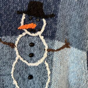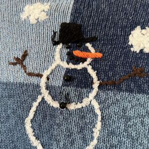 Vintage Breckenridge Blue and white snowman embroidered and beaded cardigan womens size L. Note: some of the beading is unraveling on the snowman on the back - see photo #winterknits