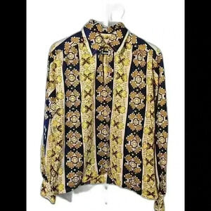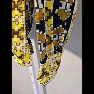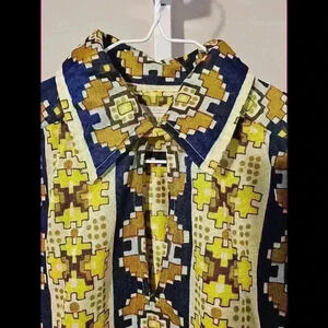 Add a bold statement to your wardrobe with this Vintage Graphic Print Button-Up Shirt. Featuring a unique and colorful pattern in shades of navy, yellow, and cream, this shirt is perfect for both casual and semi-formal occasions. The classic collar and button-up design ensure versatility. Key features include: