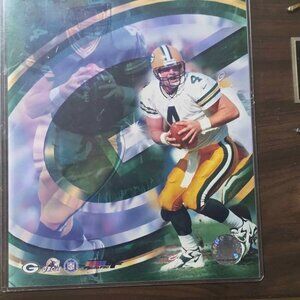 This is a great chance to own a piece of Green Bay Packers history! I'm selling a vintage Brett Favre photo plaque, still largely in its original factory-sealed plastic, even with a few small rips. It's in fantastic, pristine condition, perfect for any fan or collector. This piece has been well-preserved and has no damage to the plaque itself.