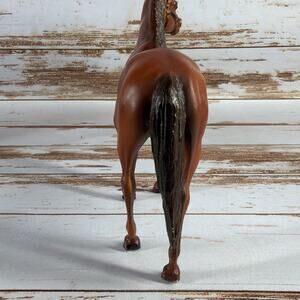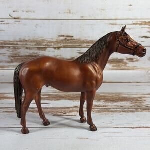 Vintage Breyer “Man O’ War” model horse No. 47 in chestnut. Produced by Breyer Molding Co. in traditional 1:9 scale. Sculpted in tribute to the legendary American Thoroughbred racehorse. Features molded mane and tail, raised leg pose, and rich chestnut finish. A classic collector’s piece from Breyer’s early lineup.