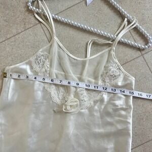 Keywords: slip dress, lingerie, nightie, lace trim, sheer panel, rose detail, satin slip, vintage slip, bridal lingerie, white slip, cream slip, spaghetti strap dress, nightgown