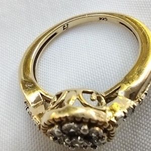 This Vintage Bridal Style Vermeil Gold Plated CZ Sterling Silver Ring / Size Seven has a raised circular base. Sterling silver base with Gold Plating cover, and 7 tiny CZ stones set in a circular pattern on top.
