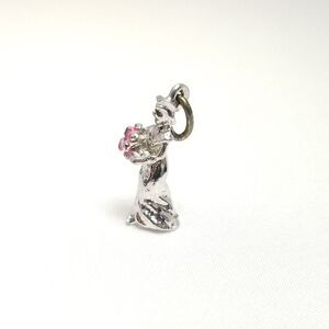 Vintage Bride with Bouquet Charm Pendant, Silver Tone Pink Enamel, Wedding