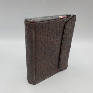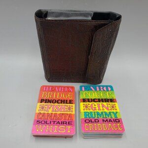 * Brown vinyl case holds two decks of playing cards and a scorepad, pencil is missing, case closes with a snap