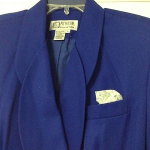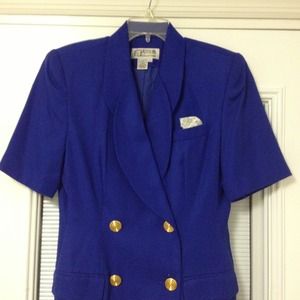 Bright Vibrant Blue Dress with gold colored buttons. Button down dress. Handkerchief comes with dress, sewn into pocket. Fake two front pockets. Shoulder pads. Dress 65% Polyester 35% Rayon Lining 100% Polyester