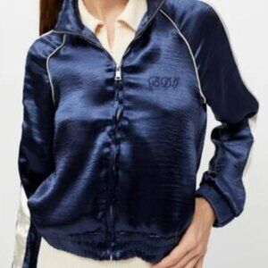 Classic light-weight track jacket silhouette elevated with fabric smooth as rippling water.