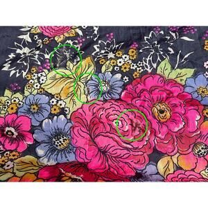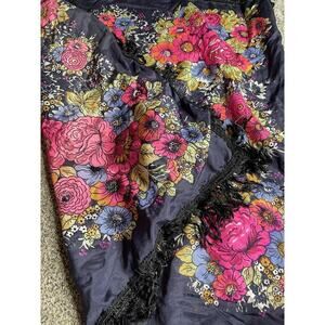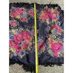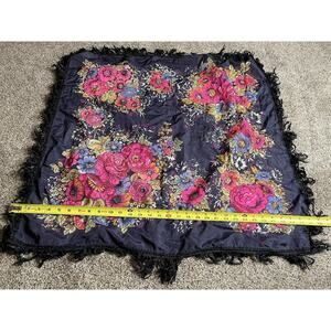 Vintage Bright Floral Neon Scarf Fringe Navy Blue Ukrainian Russian