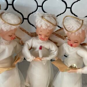Each angel is dressed in a delicate white gown with lace trim and gold tinsel halo. Hand-painted faces and soft felt details give them that unmistakable mid-century charm collectors love.