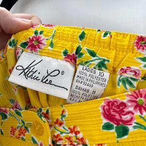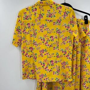 Kathi Lee vintage bright yellow with pink peony all over floral blouse and skirt set. Short sleeve blouse, collared, with button front detail, elastic waist skirt, button front. Women's size 10 both pieces are in very good condition.