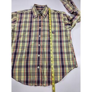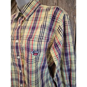 Cruel grilled bright plaid button up. Measurments in pictures, Ships fast. Stains on one of the sleeves as pictured. Have not attempted to stain release.