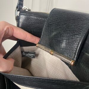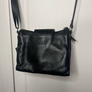 Beautiful black leather purse with long adjustable crossbody strap. Several zipper compartments and built in wallet. Interior is in good condition with some staining, most evident within the large back pocket. Magnetic closure and also has magnets within the compartments to allow for an overall compact purse. Sole tarnish to the metal closure but still very usable and gives it some charm. Overall has a western feel to the bag.