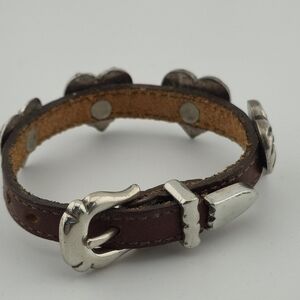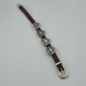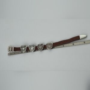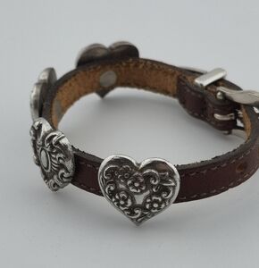 Vintage leather bracelet by Brighton featuring five silver-tone heart conchos with ornate designs. Western-inspired buckle closure with signature Brighton detailing throughout. Measures 9.5" end to end. A bold statement piece with a rustic charm — perfect for stacking or wearing solo.