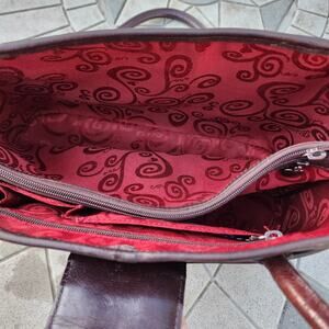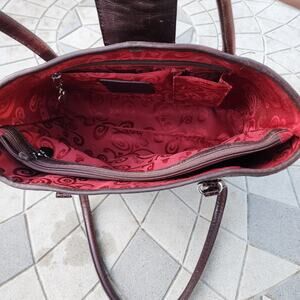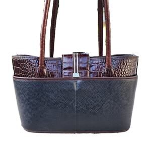 VTG: Stylish, black/brown genuine leather tote/shoulder bag with signature croc embossed print / double roll handles / top flap magnetic snap closure / exterior slip pockets / silver tone hardware / heart charm accent / red fabric lining / divided compartment / creed label / multiple pockets by Brighton Collection.