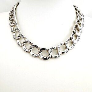 Brighton silver tone etched scroll interlocking necklace with foldover clasp and one removable link, if you want a shorter length. The length can be either 16.75" or 17.75". This is a substantial necklace and is not lightweight. Overall very good vintage condition. Minimal signs of wear. Overall color and finish is very good. Signed Brighton on both closure links. Includes Brighton floral heart tin.